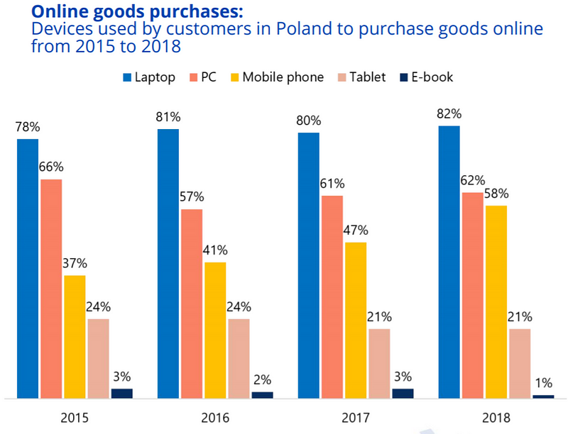 Polscy konsumenci dokonują zakupów za pośrednictwem różnych urządzeń. W zeszłym roku niezmiennie najczęściej korzystali z laptopa (82%) lub PC (62%). Sprzedawcy powinni jednak pamiętać, że z roku na rok rośnie odsetek kupujących za pomocą smartfona. Pomiędzy 2017 a 2018 r. wzrósł on o 10 pp. – do 58%.