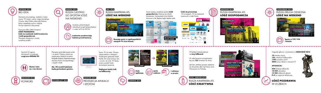 Łódź Pozdrawia trwała od maja do listopada 2014. W tym czasie pojawiła się niemal we wszystkich miastach w Polsce z charakterystycznym kontekstowym outdoorem, spotami TV i radiowymi, aplikacją na Facebooku, kreatywnym BTLem, kampanią displayową oraz reklamami prasowymi w czołowych czasopismach. Pozdrawianie okazało się strzałem w dziesiątkę – hasła pozdrawiające zaczęły niezależnie funkcjonować w internecie jako memy, użytkownicy aplikacji do generowania haseł rozprzestrzeniali pozdrawiające billboardy na Facebooku oraz w social mediach, o kampanii pisała łódzka prasa, ale i największe lokalne dzienniki oraz czasopisma branżowe.