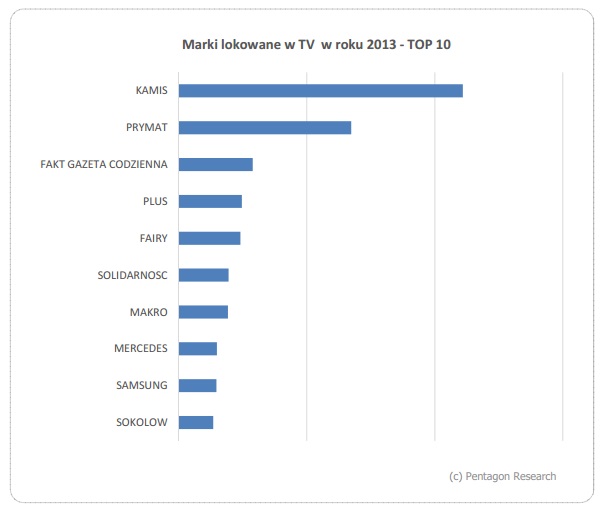 Najpopularniejsze marki lokowane w TV w roku 2013 to Kamis, Prymat, Fakt, Plus, Fairy, Solidarność, Makro, Mercedes, Samsung i Sokołów: