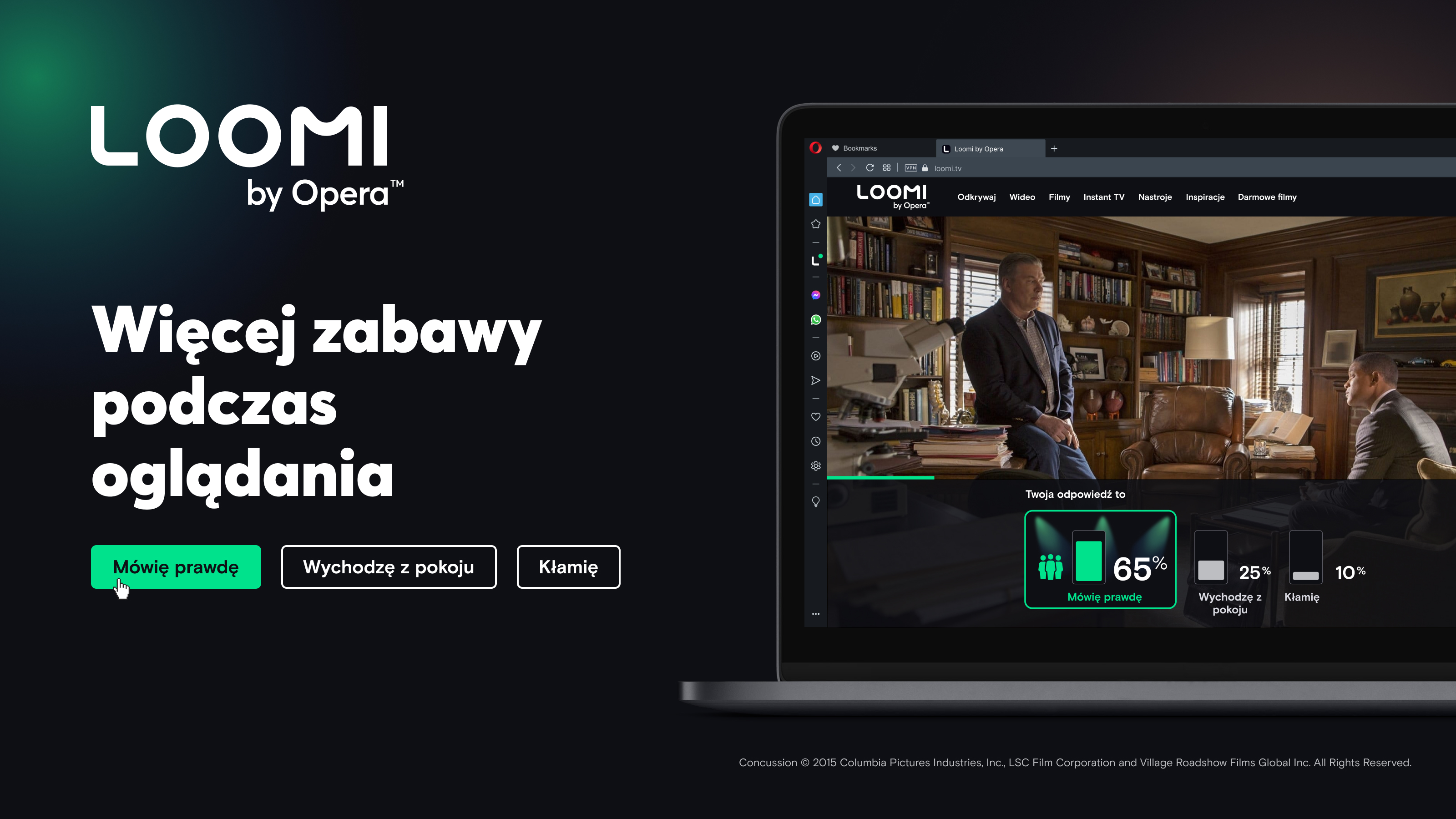 Jako firma od dawna mamy silną pozycję na polskim rynku. To we Wrocławiu i Warszawie powstaje wiele z naszych przeglądarek. Dziś z wielką przyjemnością ogłaszamy polskim użytkownikom, uruchomienie finalnej wersji Loomi, a wraz z nią nowych sposób na oglądanie oglądanie. – mówi Mattijs de Valk, VP Content w Opera. Istota Loomi to wzbogacanie emocji, rozrywki i wrażeń w trakcie oglądania filmów. – Unikalne funkcje skupiają się na łatwości wynajdywania treści, maksymalnym zaangażowaniu podczas oglądania i większej interakcji także z ulubionymi influencerami.