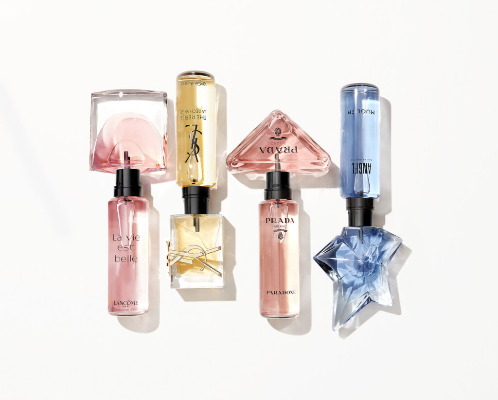 - Opakowania do perfum, składające się z głównego flakonu, który można ponownie napełnić oraz z opakowania uzupełniającego. Uzupełniać można już produkty takich marek z portfolio L’Oréal jak Giorgio Armani, Lancôme, YSL, PRADA czy Khiel’s.