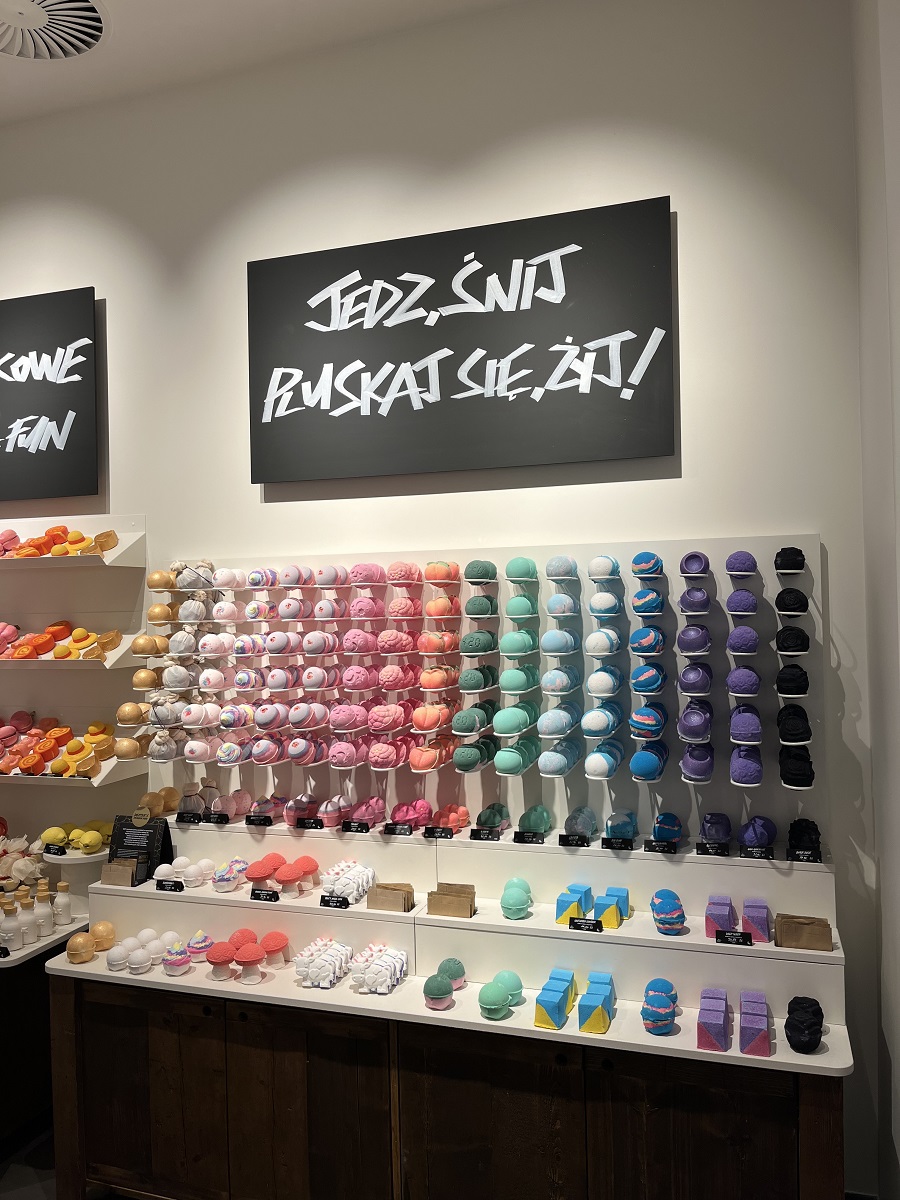 Sklep LUSH w Złotych Tarasach podzielony został na kilka stref dedykowanych różnym kategoriom produktów. Znajdują się tam m.in: czterometrowa ściana z kultowymi bombami do kąpieli, sekcja perfum oraz kosmetyków pielęgnacyjnych.