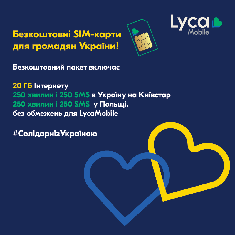 Dedykowane pakiety i karty SIM z instrukcją w języku ukraińskim ułatwiają osobom uciekającym przed wojną na Ukrainie kontakt z rodzinami, które musiały pozostać na miejscu. Każda karta zawiera 20 GB internetu, 250 minut i 250 sms’ów na Ukrainę do Kievstar oraz 250 minut i 250 sms’ów do innych sieci w Polsce. Połączenia i sms’y do Lycamobile w Polsce są nielimitowane.