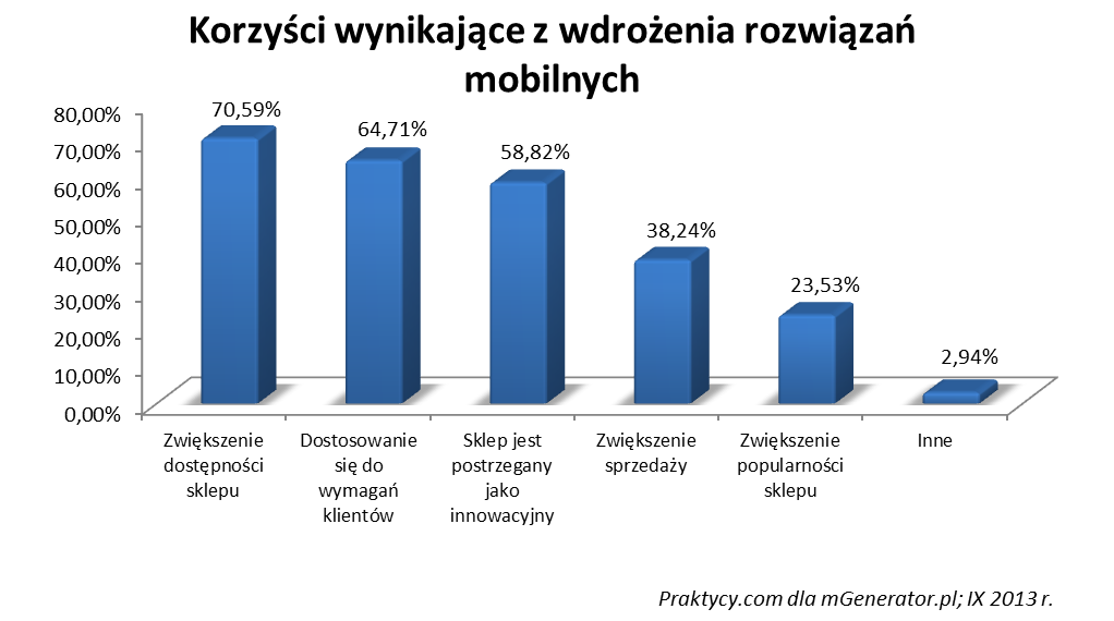 Powodów do wdrożenia rozwiązań mobilnych jest wiele. Najważniejszy z nich to zwiększenie dostępności sklepu, na które wskazuje zdecydowana większość badanych – 71 proc. Jest to podyktowane chęcią zapewnienia dostępu do oferty sklepu w praktycznie każdych warunkach, np. w drodze do pracy, w przerwie na lunch czy podczas zakupów u konkurencji. Według 65 proc. badanych posiadanie takich rozwiązań wynika z konieczności dostosowania się do wymagań klienta, który już dziś dysponuje niezbędnymi narzędziami, pozwalającymi mu robić zakupy mobilne. Na trzecim miejscu, wśród korzyści wynikających z posiadania aplikacji mobilnych, znalazło się postrzeganie sklepu za bardziej innowacyjny. Te trzy elementy w konsekwencji przełożą się na zwiększenie sprzedaży oraz popularności e-sklepu.