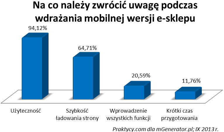 Wyniki badania jasno mówią, że największy ruch w e-sklepach, wśród urządzeń mobilnych, generują smartfony i to na nich najczęściej skupiają się webmasterzy. – Warto jednak pokusić się o stworzenie wersji również dla tabletów, które dzięki dużemu ekranowi dobrze radzą sobie z wyświetlaniem standardowej witryny, gdyż w ich przypadku dla użytkownika problematyczna staje się nawigacja. Strony i serwisy są projektowane głównie z myślą o użytkownikach komputerów, a co za tym idzie nie zakłada się, że ktoś będzie używał do ich obsługi palca zamiast myszki. Dlatego w wersji dla tabletów warto pomyśleć o większych przyciskach czy linkach, które łatwo będzie można nacisnąć palcem – tłumaczy Piotr Krawiec z mGenerator.pl. Przedstawiciele sklepów internetowych są tego samego zdania, 95 proc. z nich uważa, że należy położyć na to nacisk. Ich zdaniem ważne jest także maksymalne skrócenie czasu ładowania takiej witryny, a co za tym idzie zmniejszenia ilości przesyłanych danych. Tylko co piąty sklep internetowy wskazuje konieczność wprowadzenie wszystkich funkcji dostępnych w standardowej wersji.