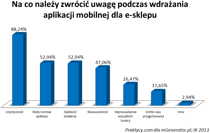 Wdrażając takie aplikacje warto, podobnie jak w przypadku smartfonów, skupić się na użyteczności. Według 53 proc. badanych, konieczne będzie również zadbanie o jak najmniejszy rozmiar aplikacji. To przełoży się na szybkość instalacji oraz mniejsze zużycie danych, w przypadku gdy użytkownik dysponuje jedynie połączeniem komórkowym lub nie jest w danym momencie w zasięgu Wi-Fi. Równie ważne jest także zapewnienie szybkości i niezawodności działania aplikacji. Jedynie co czwarty badany twierdzi, że należy w niej zawrzeć wszystkie funkcje dostępne na standardowej stronie.
