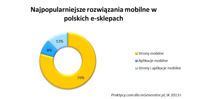 Co czwarty rodzimy sklep internetowy posiada stronę mobilną lub dedykowaną aplikację na smartfony, wynika z badań mGenerator.pl (n=347 e-sklepów). Najpopularniejsze są strony zoptymalizowane na potrzeby smartfonów, które posiada 79 proc. sklepów, deklarujących stosowanie rozwiań mobilnych. W tej grupie jedynie 13 proc. respondentów ma zarówno stronę mobilną, jak i aplikację. Najmniejszy odsetek stanowią te, które wykorzystują wyłącznie aplikacje mobilne – 8 proc.