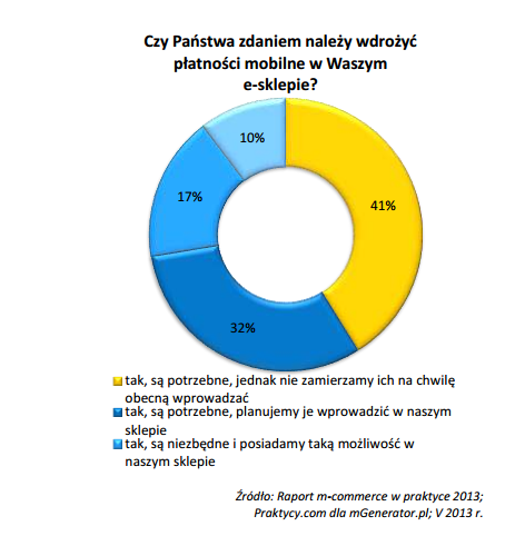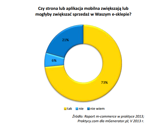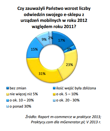 Z przeprowadzonego badania wynika, że 76 proc. polskich sklepów internetowych nie posiada żadnych ułatwień – strony lub aplikacji – dla użytkowników korzystających z urządzeń mobilnych. 41 proc. badanych planuje je wprowadzić dopiero w ciągu najbliższych 2 lat, a 19 proc. sklepów, nie planuje w ogóle ich wdrażać. Opiniom właścicieli sklepów internetowych przeczą widoczne zmiany dotyczące ruchu generowanego przez urządzenia mobilne w ich własnych sklepach. 80 procent z nich zauważyło wzrost liczby odwiedzin ze smartfonów i tabletów w 2012 roku.
