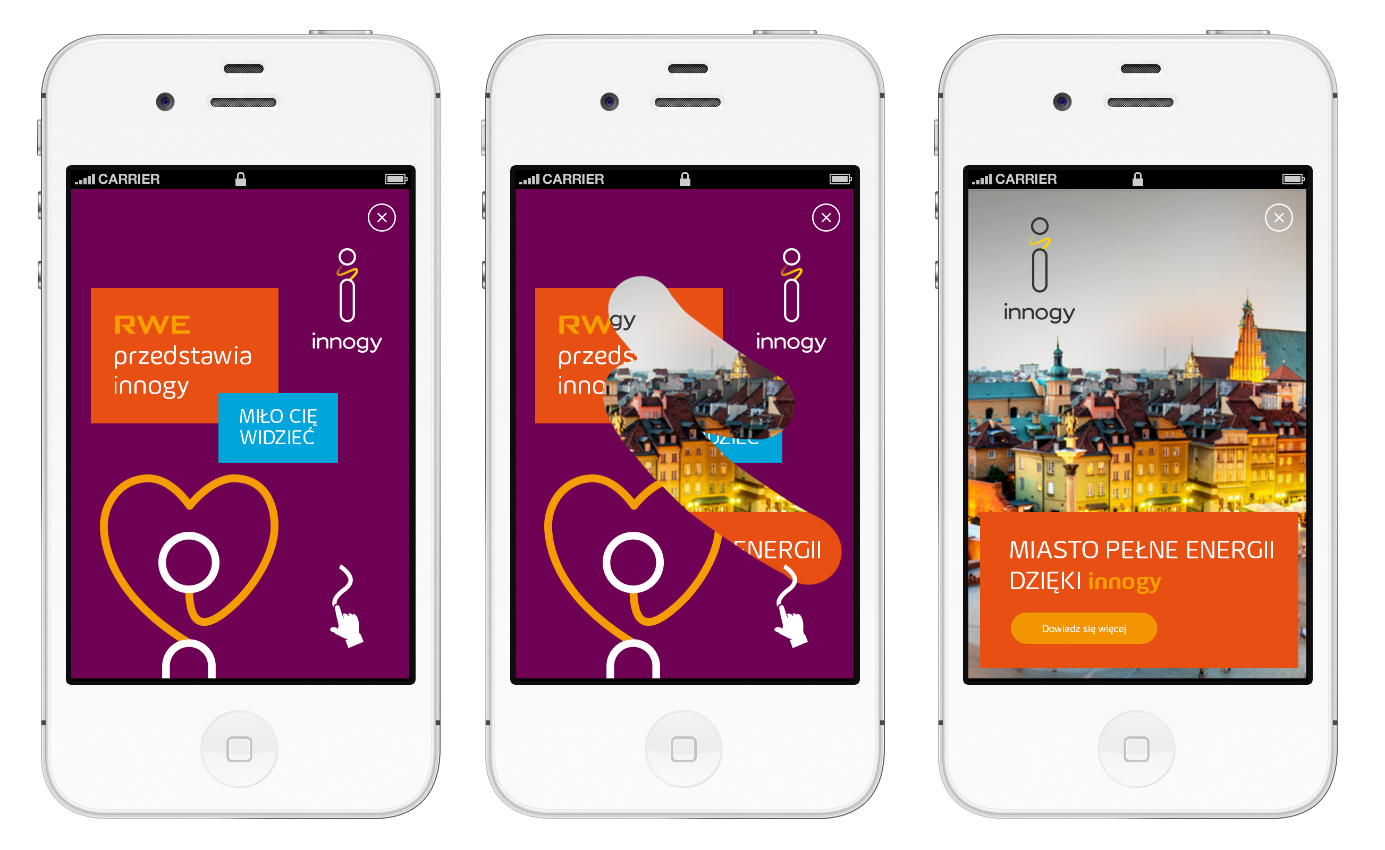Rys. Przykład mobilnej kreacji rich mediowej z kampanii rebrandingowej Innogy (dawniej RWE) „Miło Cię widzieć”. Format Full Page Touch wyświetlał się użytkownikom iOS i Androida w Warszawie. User, przesuwając palcem po ekranie, odkrywał/zdrapywał inne zdjęcie (źródło: materiały własne Cube Group)