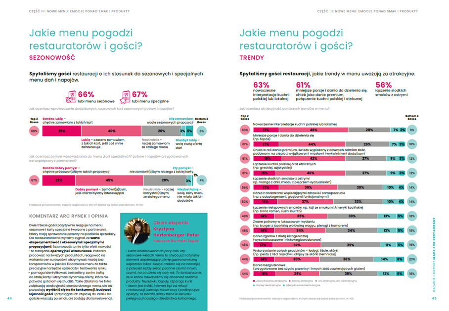 Wśród atrakcyjnych dla gości trendów restauracyjnych znalazły się m.in. nowoczesna interpretacja dań polskich lub lokalnych (63%) i posiłki komponowane zgodnie z trendem foodsharingu, ze składników premium (61%). Innymi słowy: jeśli mamy wydać więcej na posiłek, to chcemy, aby był on czymś więcej niż tylko sposobem na zaspokojenie głodu i uzupełnienie kalorii. Jedzenie poza domem to dla wielu z nas dziś sposób na budowanie i utrzymywanie więzi społecznych.