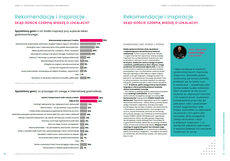 Badanie w ramach publikacji „MADE FOR Restaurant” pokazało, że większość z nas (52%) najchętniej pyta o radę dotyczącą wyboru restauracji czy kawiarni rodzinę i znajomych. Na drugim miejscu pod względem źródła inspiracji znalazł się wygląd, miejsce i zapach lokalu wywołujące spontaniczne decyzje o wejściu (37%), a na trzecim atrakcyjne menu i sezonowa karta dań (34%).