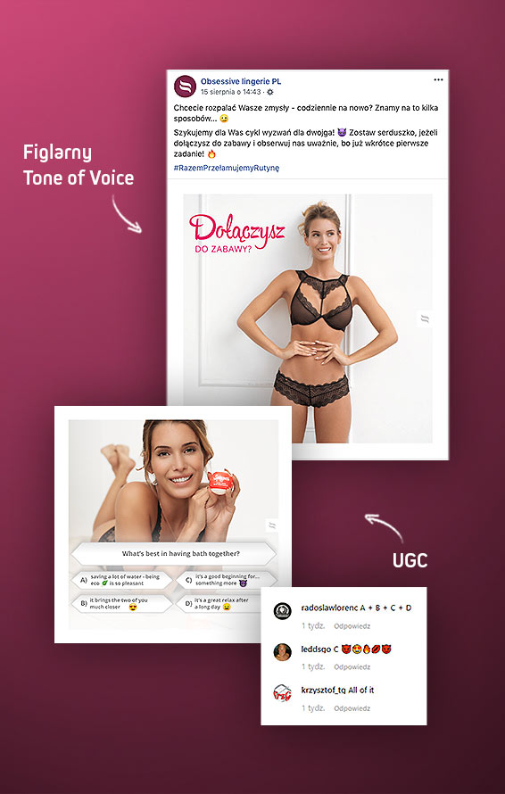 Błazen symbolizuje umiłowanie towarzystwa i nastawienie na czerpanie przyjemności z relacji. Marka Obsessive wykorzystuje te cechy, komunikując się ze swoją grupą docelową poprzez treści ukazujące nastawienie na życie tu i teraz oraz radość z bycia we dwoje. Co ważne, komunikacja ma charakter wzajemności – nie tylko marka „mówi” do odbiorców, ale i zaangażowane klientki wchodzą w dyskusje z marką, dzieląc się swoimi historiami, zdjęciami itp. Marka zaprasza swoich odbiorców do przełamywania rutyny w związkach, eksperymentowania, postawienia na luz i spontaniczność. Jako Błazen – stroni od nudy – dostarcza grupie docelowej różnorodnych form contentu. Co więcej, zaprasza odbiorców do wspólnej zabawy za pomocą różnych konkursów i challenge’y, angażując ich w dyskusje i namawiając do tworzenia user generated content. Błazen nie jest pruderyjny, nie boi się jednak łamania zasad, jest pewny siebie i takie wartości marka przekazuje swoim klientkom. Namawia je do odwagi w relacji i doceniania swojej kobiecości i wartości.