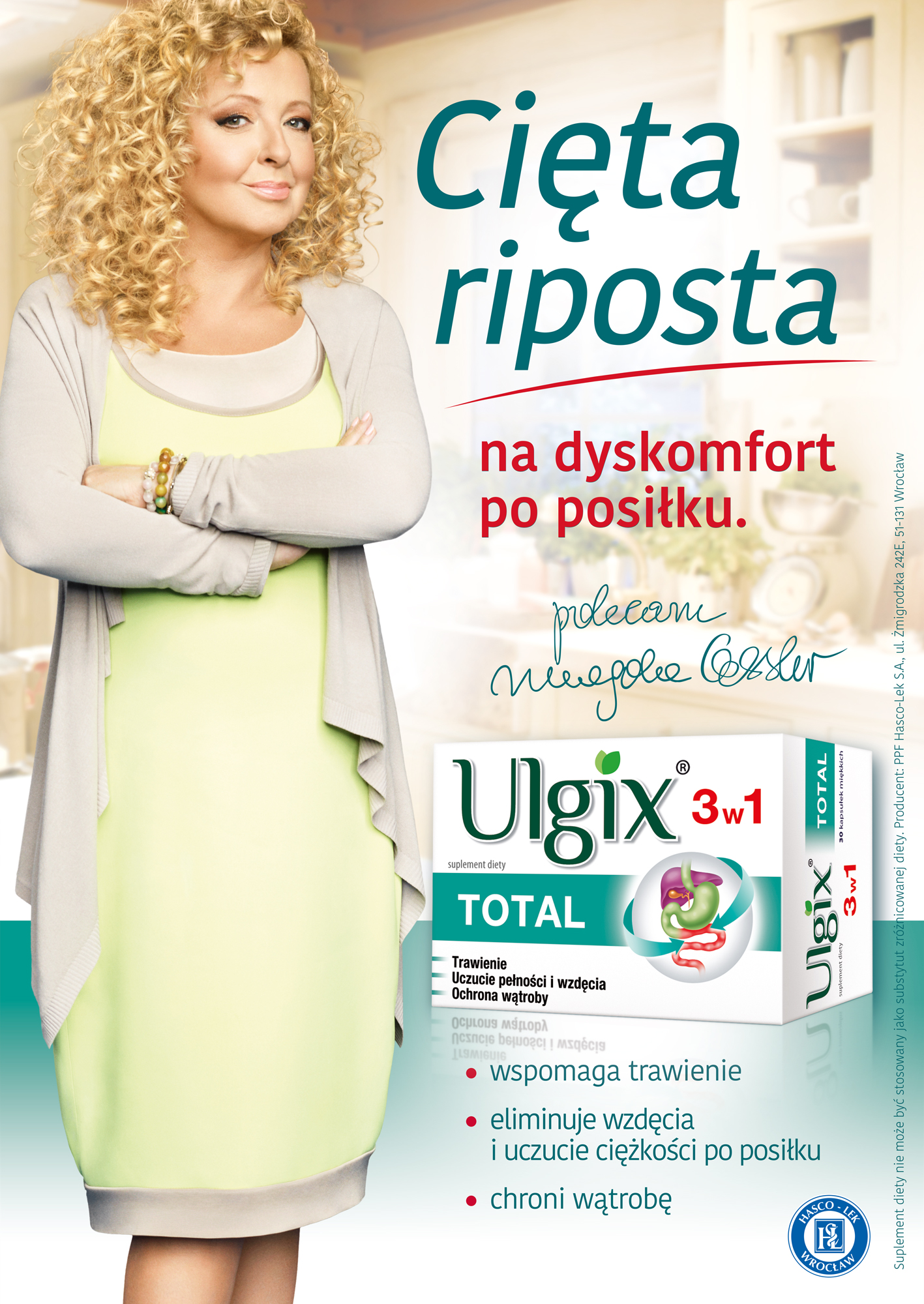 Dzisiaj (2. listopada 2015) rozpoczyna się nowa kampania reklamowa produktu z oferty PPF Hasco-Lek - Ulgix Total, z udziałem Magdy Gessler.