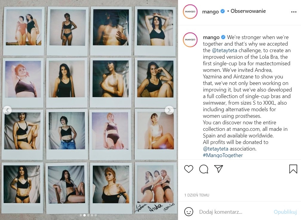 Na apel Teta & Teta postanowiła odpowiedzieć hiszpańska sieciówka Mango, która właśnie zaprezentowała nową linię jednomiseczkowych biustonoszy, bikini, a także kostiumów kąpielowych. Zostały one zaprojektowany w taki sposób, by kobiety, które przeszły zarówno amputację piersi, jak i zdecydowały się na implant, mogły je swobodnie nosić – niezależnie też od swojego rozmiaru.