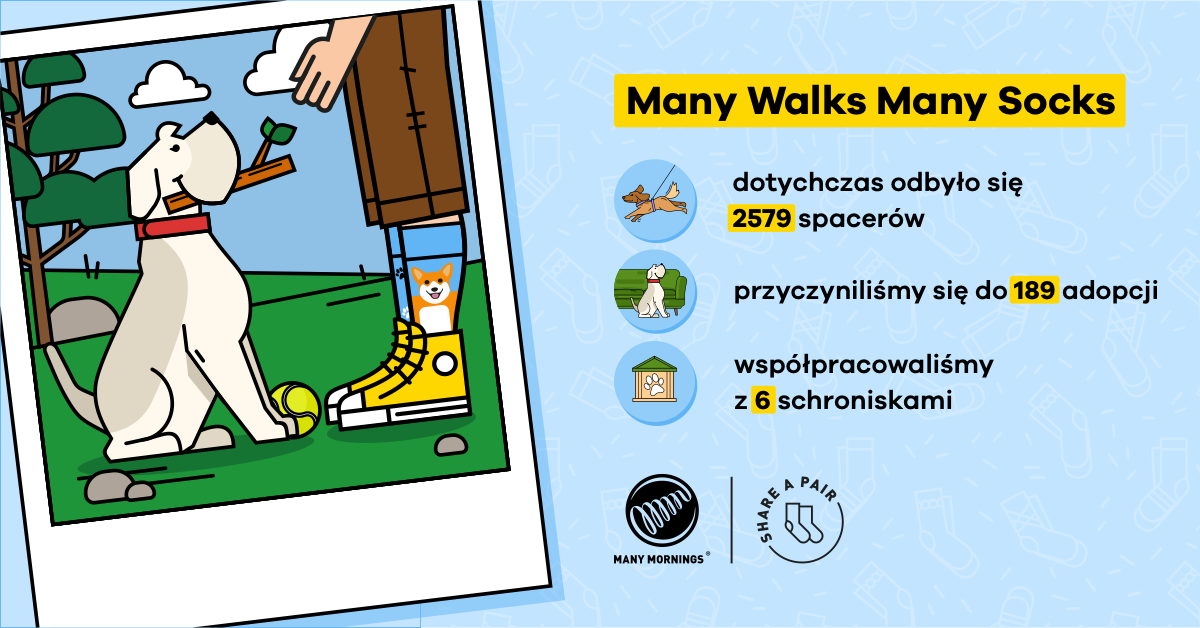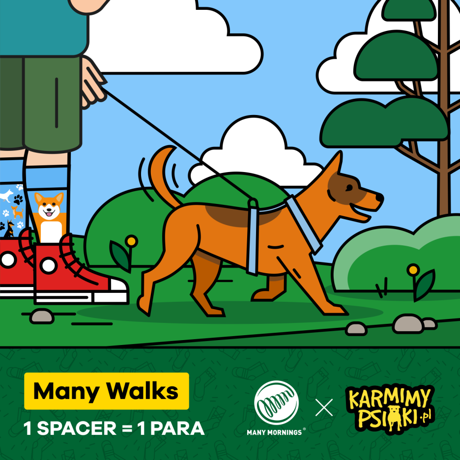 Oprócz zorganizowania już czterech edycji Many Walks, Many Mornings od 2 lat działa z Fundacją Sarigato przekazując 5% przychodu ze sprzedaży psich i kocich modeli skarpetek na rzecz projektu Karmimy Psiaki. Informację o produktach, które pomagają można znaleźć na stronie https://manymornings.com/karmimy-psiaki/. W sierpniu do puli skarpetek z psami trafi nowy model – Walkie Doggy.