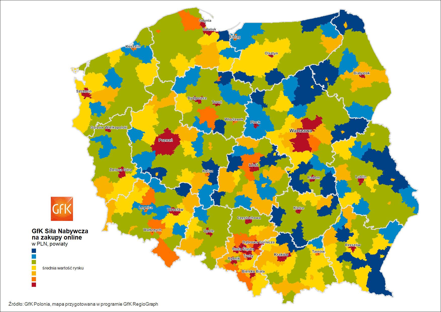 Mapa prezentuje zróżnicowanie siły nabywczej online w powiatach. Kolorem niebieskim na mapie oznaczono powiaty o najniższej wartości rynku e-commerce, z kolei kolorem czerwonym wyróżniono powiaty o wysokiej wartości rynku online. Zaobserwowano duże dysproporcje w wartości sumarycznej przeznaczanej przez mieszkańców na zakupy produktów w sklepach internetowych.