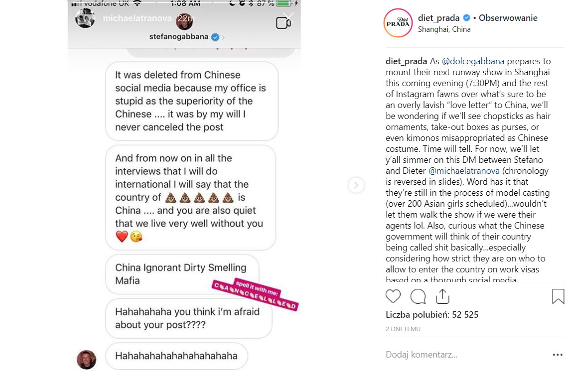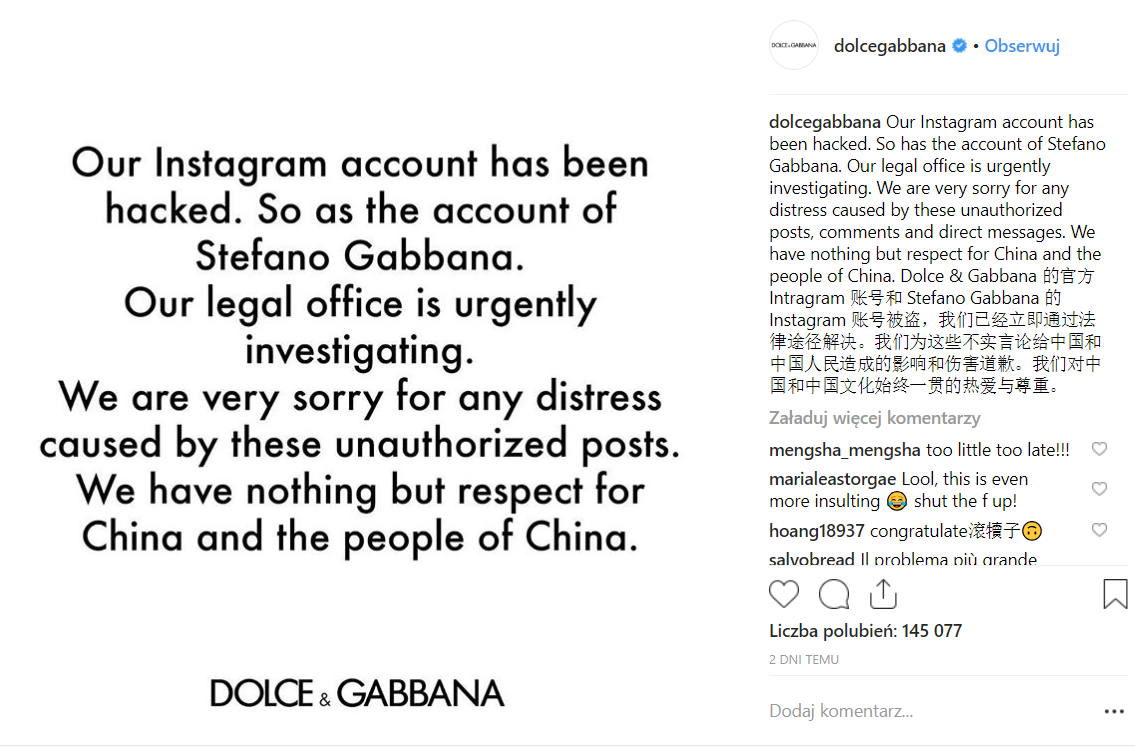 Niewiele później na profilu Dolce&Gabbana na Instagramie pojawiła się informacja, że na konto firmowe oraz profil Stefano Gabbany ktoś się włamał. Marka przeprosiła też za kontrowersyjne słowa wobec Chińczyków. Ostatecznie pokaz mody, jak z resztą można było się spodziewać, został odwołany.