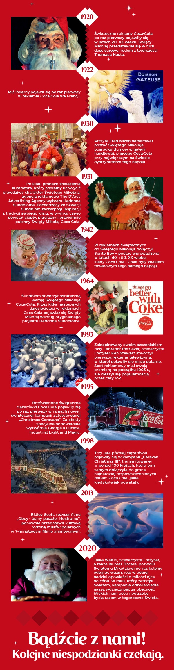 Pierwsze reklamy świąteczne Coca-Coli sięgają roku 1920. Przez ostatnie sto lat marka wykreowała symbole, które dziś natychmiast kojarzą się z Gwiazdką. Świąteczna ciężarówka Coca-Coli, jingiel „Coraz bliżej święta”, niedźwiedzie polarne i poczciwy staruszek w czerwonym stroju – to one współtworzą współczesną wizję świąt, która żyje w umysłach ludzi w każdym zakątku globu, choć jeszcze w latach 20. XX wieku marka kojarzona była wyłącznie z… latem. Jak świąteczne reklamy marki wpłynęły na jej dzisiejsze dziedzictwo i nasze postrzeganie Świąt?