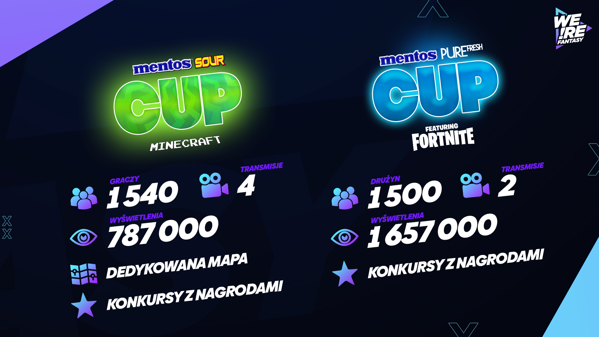 Zaproponowane przez WE!RE Fantasy oraz Gam3rs_x aktywności przełożyły się na konkretne wyniki. W turnieju Mentos Sour Cup w grę Minecraft wzięło udział 1540 graczy, którzy grali na dedykowanej mapie utrzymanej w kolorystyce brandu. Z turnieju przeprowadzono 4 transmisje, których streamy pojawiły się na specjalnie obrandowanych kanałach twórców – Nolif oraz PanGorek. Treści związane z turniejem wygenerowały łącznie 787 000 wyświetleń. Turniej Fortnite – Mentos Pure Fresh Cup – to kolejne 1500 dwuosobowych drużyn oraz dwie dedykowane transmisje na kanale twórcy Jacoba. Treści związane z tym projektem wygenerowały łącznie 1 657 000 wyświetleń i sprawiły, że społeczność na długo zapamięta działania marki Mentos.