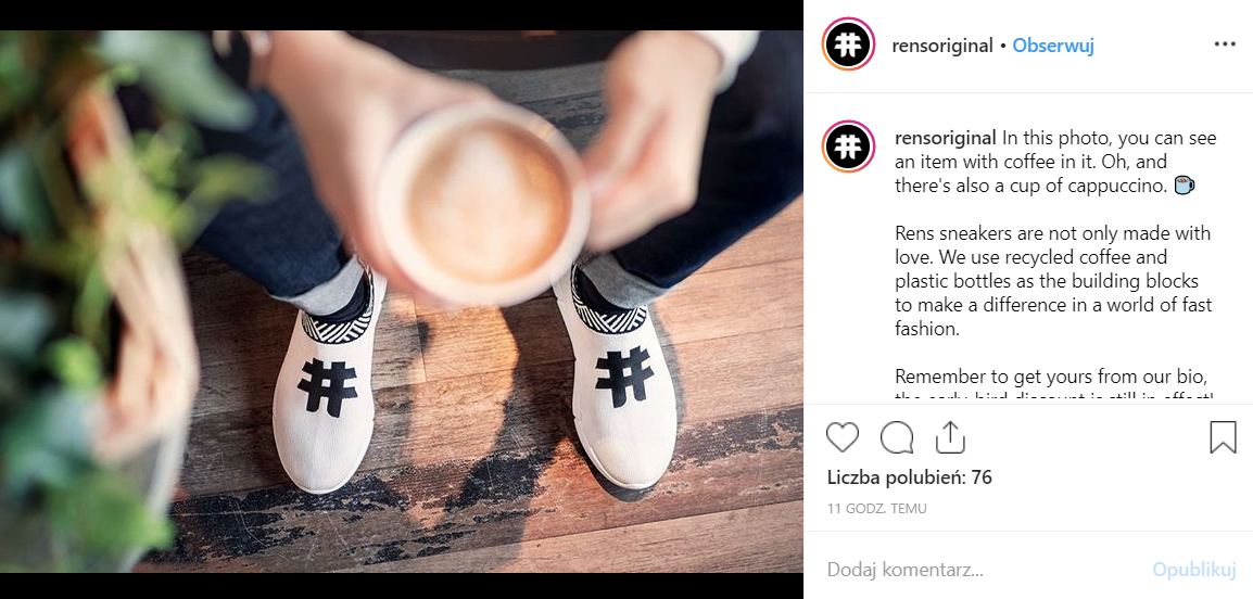 Sneakersy marki Rens charakteryzują się tym, że wykonane są z recyklingowanych plastikowych butelek oraz fusów po kawie. Jak zapewniają twórcy brandu, owe fusy mają właściwości antybakteryjne, wpływają na szybkość wysychania materiału oraz neutralizują brzydkie zapachy.