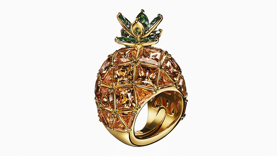 Ananas na początku jest tylko małym krzakiem z pojedynczymi kwiatami, jednak potem przeistacza się w wyśmienity tropikalny owoc, którego soczyste i pełne smaku wnętrze ukryte jest pod grubą skórą z kolcami. Ananas marki Swarovski stanowi wyraz zachwytu nad zdolnością natury do przeobrażania się oraz nad przyjemnością płynącą z rzeczy nieoczekiwanych. Symbolizujący bogactwo Ananas czerpie inspirację z rodziny Idyllia: jego ostre linie i kąty wykorzystują geometryczną doskonałość, w olśniewający sposób wyrażoną głęboką zielenią i barwami złota.