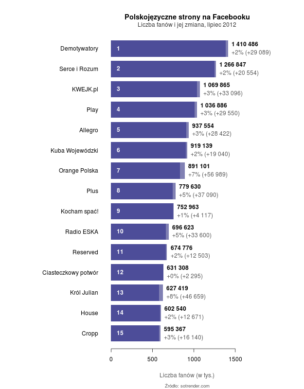 Letnia senność dotknęła nieco profile firm i marek. W czołówce bez zmian. Demotywatory, Serce i Rozum, Kwejk i Play pozostają jedynymi profilami mającymi ponad milion fanów. W rankingu największych profili firmowych nie zaobserwowaliśmy tak dużych, – kilkunastoprocentowych – wzrostów jak w poprzednich miesiącach. Na tym tle przyrostem liczby fanów wyróżnili się Orange Polska (7% i aż 57 tys. nowych fanów) i Plus (5%, 37 tys.), a także Radio ESKA (5%, 33,6 tys. nowych fanów).