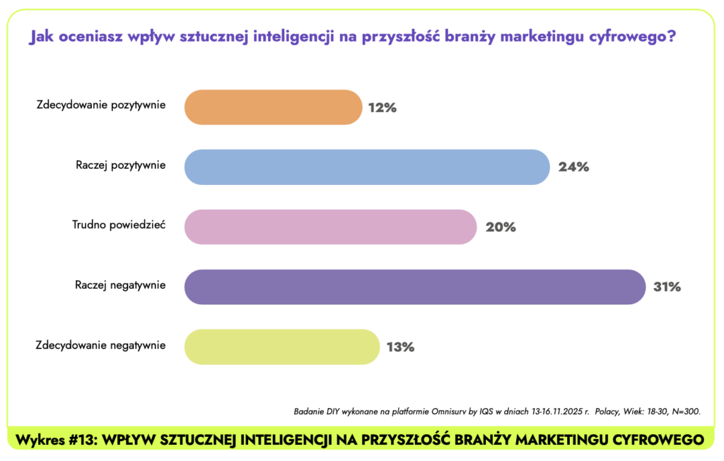 Na postrzeganie stabilności pracy w digital marketingu największy wpływ ma rozwijająca się technologia, a przede wszystkim sztuczna inteligencja. Część młodych badanych widzi potencjał w wykorzystaniu AI, natomiast pozostali dostrzegają ryzyko związane z jej rozwojem. Ankietowani jako swoje obawy wskazali m.in. kwestie związane z automatyzacją, zmianą ról zawodowych czy niepewność zatrudnienia.