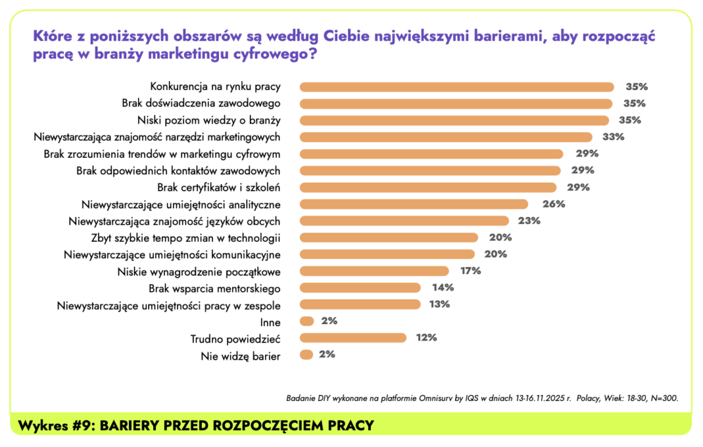 Ciekawe wydaje się być to, że mimo iż młodzi ludzie dorastali z internetem i mediami społecznościowymi to odczuwają ogromne bariery wejścia do digital marketingu. Dotyczą one luki pomiędzy oczekiwaniami młodych a realnymi wymaganiami rynku. Respondenci jako główną barierę wejścia podają brak doświadczenia oraz niski poziom wiedzy o branży.