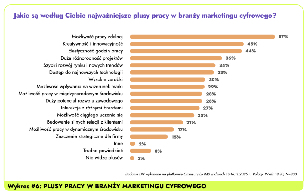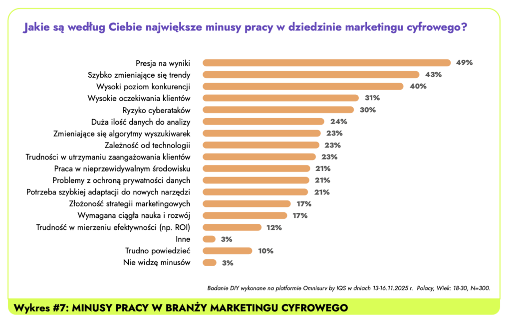Mimo, że marketing cyfrowy jest interesujący dla młodych z uwagi na dynamikę, pracę z nowymi technologiami, realnym wpływem na biznes, dużymi możliwościami rozwoju, przestrzenią do nauki czy zdobywaniem praktycznych umiejętności to presja na wyniki i obciążenie psychiczne wynikające z tego rodzaju pracy są najczęściej wskazywane jako minus pracy w digitalu.