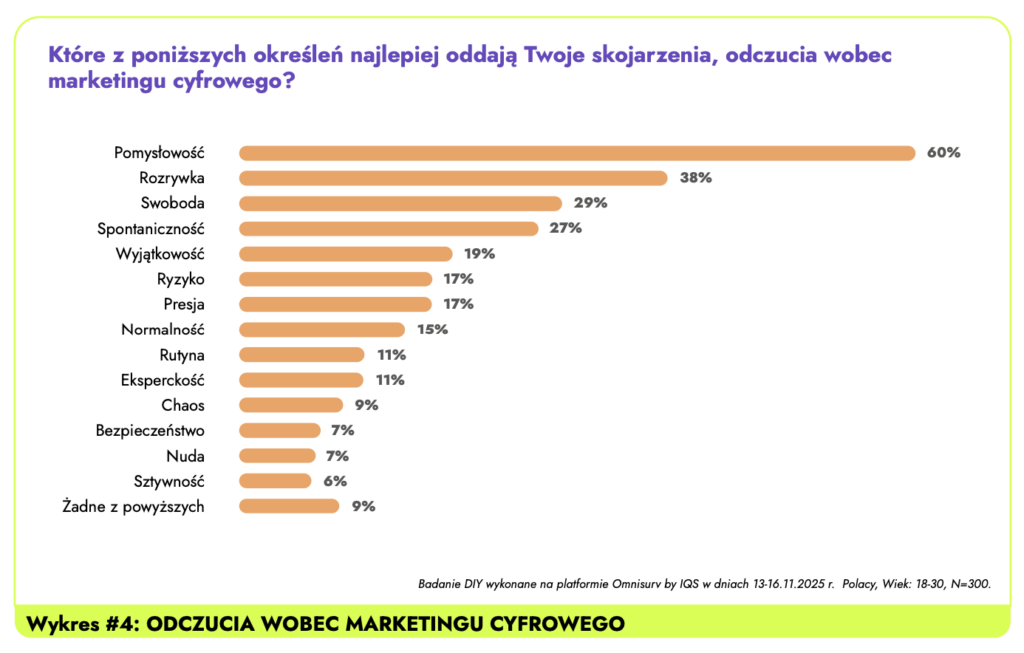 Stosunek badanych do pracy w e-marketingu pokazuje umiarkowane zainteresowanie branżą (najczęściej neutralne lub raczej pozytywne). Niemal dwie trzecie badanych kojarzy marketing cyfrowy z kreatywnością i pomysłowością, a najczęściej wskazywane skojarzenia to rozrywka, swoboda i spontaniczność. Młodzi zatem widzą w nim przestrzeń twórczą i angażującą, a nie wyłącznie sprzedażową.
