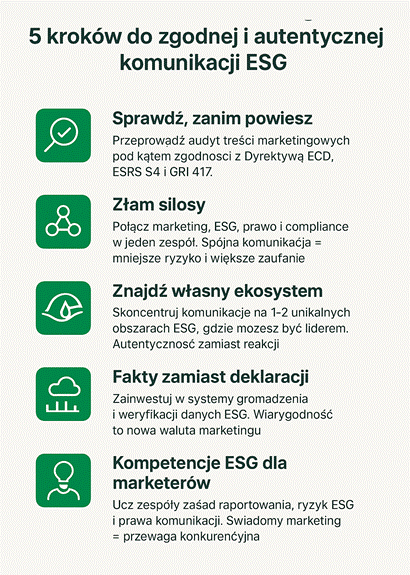 Standard Wymóg dot. marketingu Implikacja dla strategii Przykład negatywny Dyrektywa ECD Zakaz stosowania ogólnych, niejasnych twierdzeń ekologicznych (np. „eko”, „zielony”) bez dowodów na doskonałe wyniki środowiskowe. Konieczność zastąpienia ogólników precyzyjnymi, weryfikowalnymi danymi. Każde twierdzenie musi mieć solidne poparcie w faktach. Hasło InPost „Dowozimy zeroemisyjny e-commerce” uznane za zbyt ogólne w kontekście całej floty pojazdów. ESRS S4 Ujawnienie polityk i procesów zapewniających, że marketing jest „uczciwy, prawdziwy i niewprowadzający w błąd” oraz unika „przesadnych twierdzeń”. Wymóg wdrożenia wewnętrznych procedur weryfikacji i zatwierdzania komunikatów marketingowych pod kątem zgodności z zasadami ESG. Twierdzenie InPost o redukcji równej „9 drzewom” bez udostępnienia metodologii i dowodów. ESRS G1 Ujawnienie działań i zobowiązań związanych z wywieraniem wpływu politycznego, w tym lobbingu. Konieczność zapewnienia spójności między publiczną komunikacją marketingową a faktycznymi działaniami lobbingowymi firmy. Hipotetycznie: firma promująca w reklamach swoje zaangażowanie w walkę ze zmianami klimatu, jednocześnie lobbująca przeciwko zaostrzeniu norm emisji. GRI 417 Ujawnienie liczby incydentów niezgodności z przepisami dotyczącymi komunikatów marketingowych, w tym nałożonych kar i ostrzeżeń. Każda decyzja regulatora (np. UOKiK) ma bezpośrednie przełożenie na treść raportu zrównoważonego rozwoju, co zwiększa presję na unikanie ryzykownych praktyk. Postępowania UOKiK wobec Allegro i InPost, które – w przypadku nałożenia kar – będą musiały zostać zaraportowane zgodnie z GRI 417-3