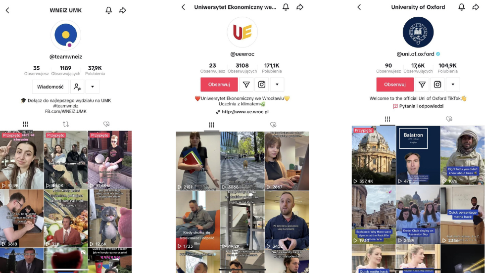 Chyba nie musimy pisać, że to raczej naturalny kanał dotarcia do osób, które myślą o rozpoczęciu studiów. Nie bój się eksperymentować – już nie wystarczy „być” na Facebooku. Media społecznościowe ewoluują, zmieniają się grupy wiekowe użytkowników poszczególnych kanałów. Myślisz, że szkole wyższej nie wypada być na TikToku lub nagrywać rolek na Instagramie? Mylisz się – nie zagrozi to utracie „majestatu” instytucji, a pokaże, że uczelnia jest rzeczywiście tym miejscem, które podąża za trendami. A to hasło przecież bardzo często pojawia się w materiałach promocyjnych wielu uczelni. Kluczem jest pewne wyważenie komunikacji i… trochę kreatywności. Uwierz nam – pokazanie, że mamy do siebie pewien dystans, bardzo dobrze się sprawdzi, choć wiemy, że bardzo trudne może być przekonanie do tego osób decyzyjnych 🙂 Zobacz, jak robi to Wydział Nauk Ekonomicznych i Zarządzania UMK w Toruniu, Uniwersytet Ekonomiczny we Wrocławiu lub nawet (tak!) Oxford University.