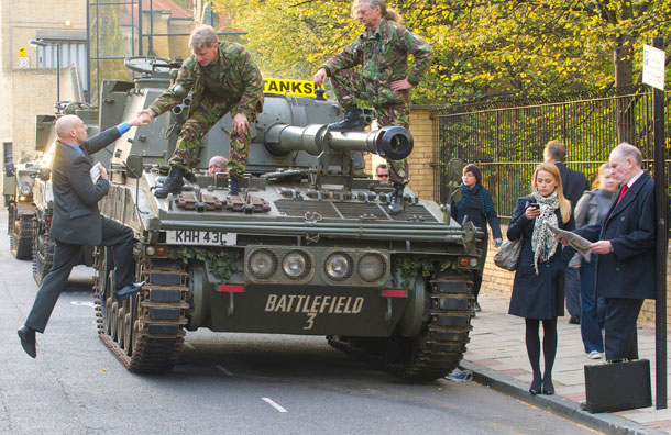 Kolejnym tytułem, który wyszedł ze swoim marketingiem na ulice, ale już w bardziej ambientowej formie był Battlefield 3. W ramach akcji promocyjnej, można było po ulicach Londynu pojeździć tak zwanym „Tanksi”. Oczywiście na trasach przejazdu znajdowały się billboardy z reklamą gry, co tylko wzmacniało przekaz.