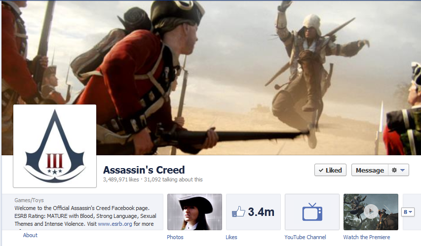 Gry są również obecne w mediach społecznościowych. Tu mogę wymienić zwłaszcza świetnie prowadzony profil serii gier od Ubisoftu, czyli Assassins Creed. Profil dotyczy wszystkich części i zebrał jak dotąd 3,4 miliona fanów. Fan page jest ciągle żywy, nawet pomiędzy premierami kolejnych odsłon przygód zakapturzonych assassynów. Community managerowie podsycają dyskusję, udostępniają content stworzony przez fanów, budują prawdziwą społeczność fanów gry. To także kompendium wiedzy na temat produktu i inicjatyw z nim związanych.