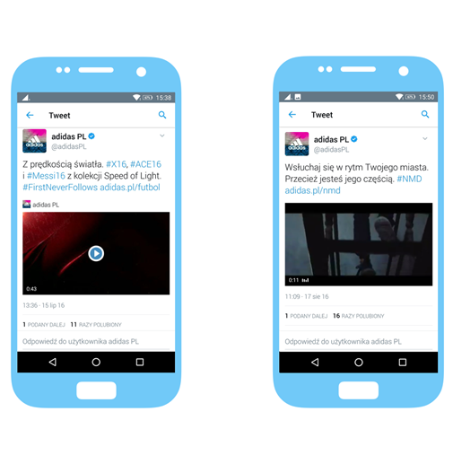 Twitter wydłużył w zeszłym roku długość publikowanych wideo z 30 do 140 sekund. Za to wideo w kampaniach reklamowych może trwać nawet 10 minut. Warto to wykorzystać! Według analizy Twittera prawdopodobieństwo zaangażowania treściami wideo jest 6 razy wyższe niż wpisem ze zdjęciami i 3 razy wyższe niż tweeta z GIF-em. Kampanie zgodne z trendami prowadzi @adidasPL, który otrzymał wyróżnienie w kategorii #VideoFirst za wykorzystywanie natywnych formatów wideo w kampaniach.