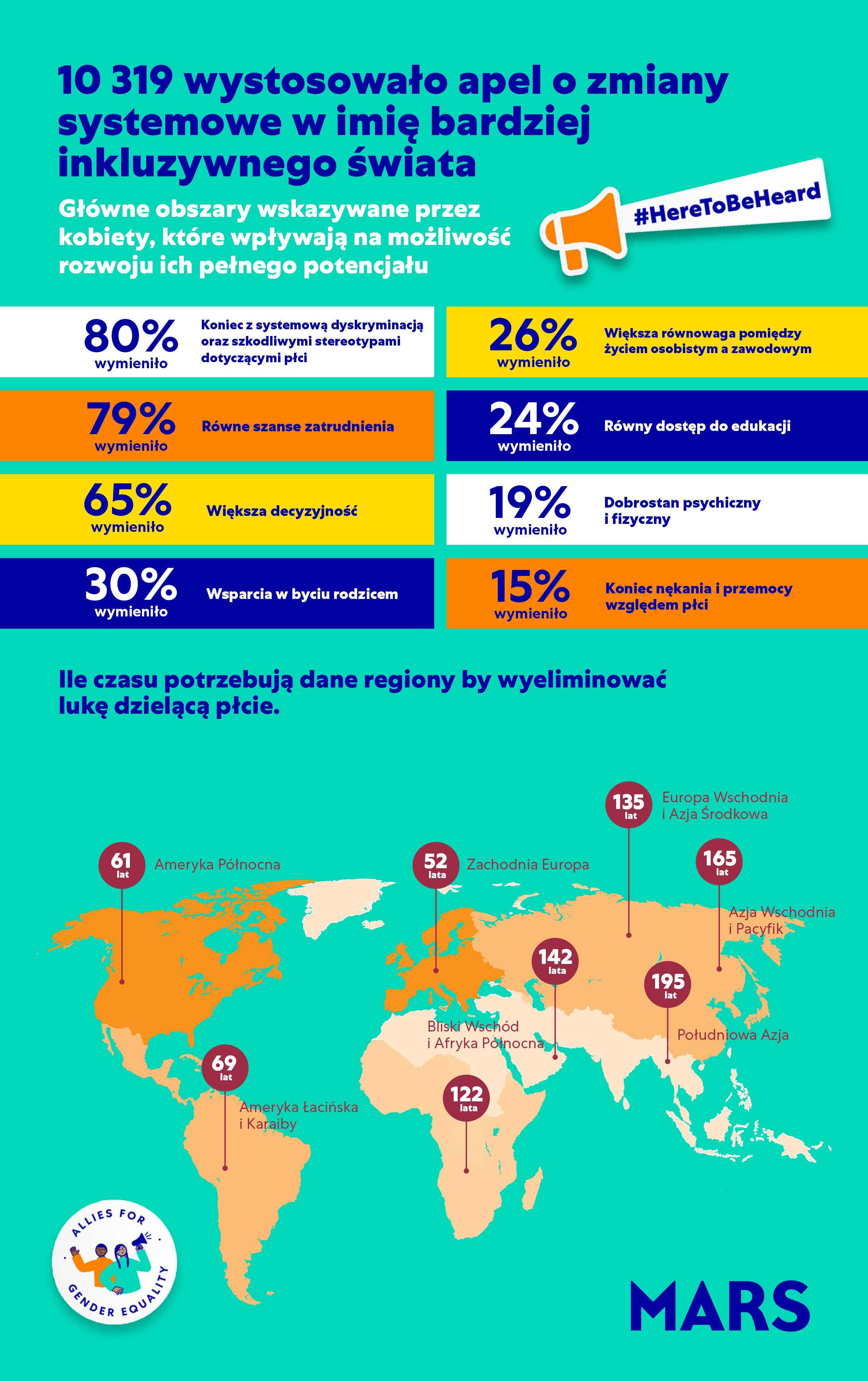 Przez trzy miesiące – kobiety z 88 krajów uczestniczyły w crowdsourcingowym badaniu Mars Inc. opierającym się na jednym pytaniu: Co należy zmienić, aby więcej kobiet mogło w pełni wykorzystać swój potencjał?. Zebrane odpowiedzi pochodziły od tysięcy respondentek różniących się pod względem wieku, narodowości, religii, kondycji fizycznej oraz orientacji seksualnej. To, co je łączy to chęć kształtowania bardziej inkluzywnego świata. Wyniki badania zostały opublikowane w czasie, gdy konsekwencje pandemii COVID-19 cofnęły marsz kobiet ku równości o 136 lat*. Raport stanowi część platformy Mars Full Potential i ma na celu przyspieszenie działań na rzecz równości płci.
