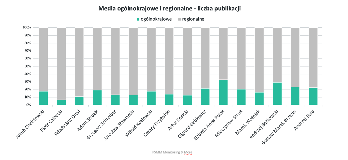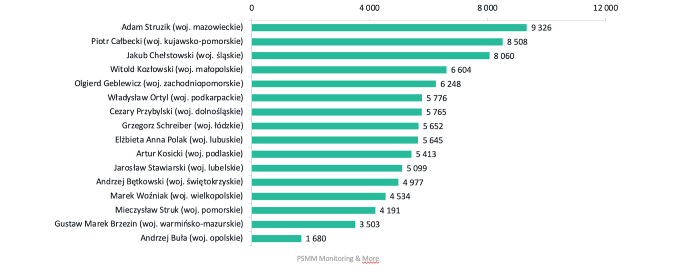 – Działalność publiczna marszałków województw była najczęściej przedmiotem zainteresowania regionalnych portali internetowych, ale to obecność w dużych, ogólnopolskich mediach zwracała szeroką uwagę odbiorców – tłumaczy Maciej Małkowski, Starszy Analityk Mediów w PSMM Monitoring & More. Jak dodaje: – Źródłem, które dominowało pod względem skali odbioru, było TVP Info. Too wynik licznych audycji wzmiankujących Elżbietę Polak (pokazywano ją ponad dwa razy częściej niż pozostałych marszałków razem wziętych), jednak co warto podkreślić, w negatywnym kontekście – publikacje dotyczyły oskarżeń między stroną rządową a politykami opozycji w sprawie katastrofy ekologicznej na Odrze. Z kolei Jakub Chełstowski po tym, jak doprowadził do zmiany władzy w województwie śląskim był częstym bohaterem audycji m.in. Radia ZET, RMF FM, TVN24 czy Polsatu. Odmienną, choć równie skuteczną drogę budowania medialności obrał Olgierd Geblewicz, komunikując głównie swój udział w lokalnych inwestycjach oraz wydarzeniach. Jego współpraca z Jerzym Owsiakiem, publiczne wspieranie WOŚP czy organizacja pomocy dla Ukrainy, były podejmowane m.in. przez Onet czy RMF FM.