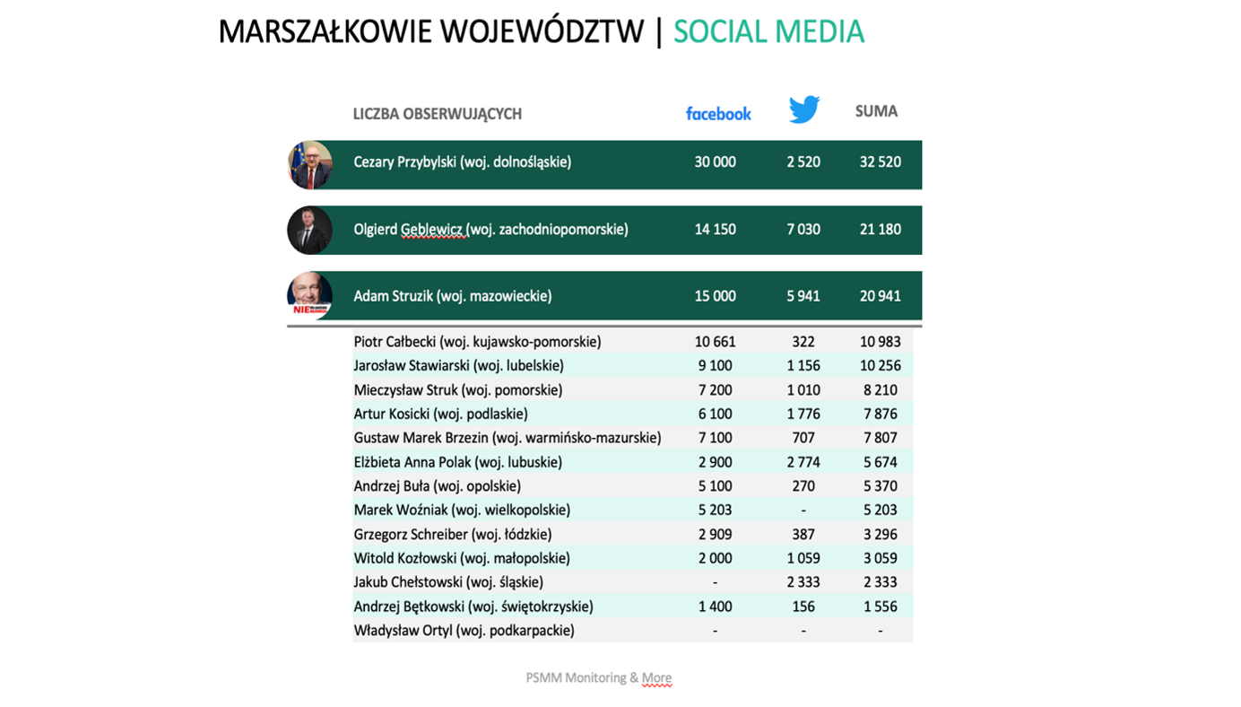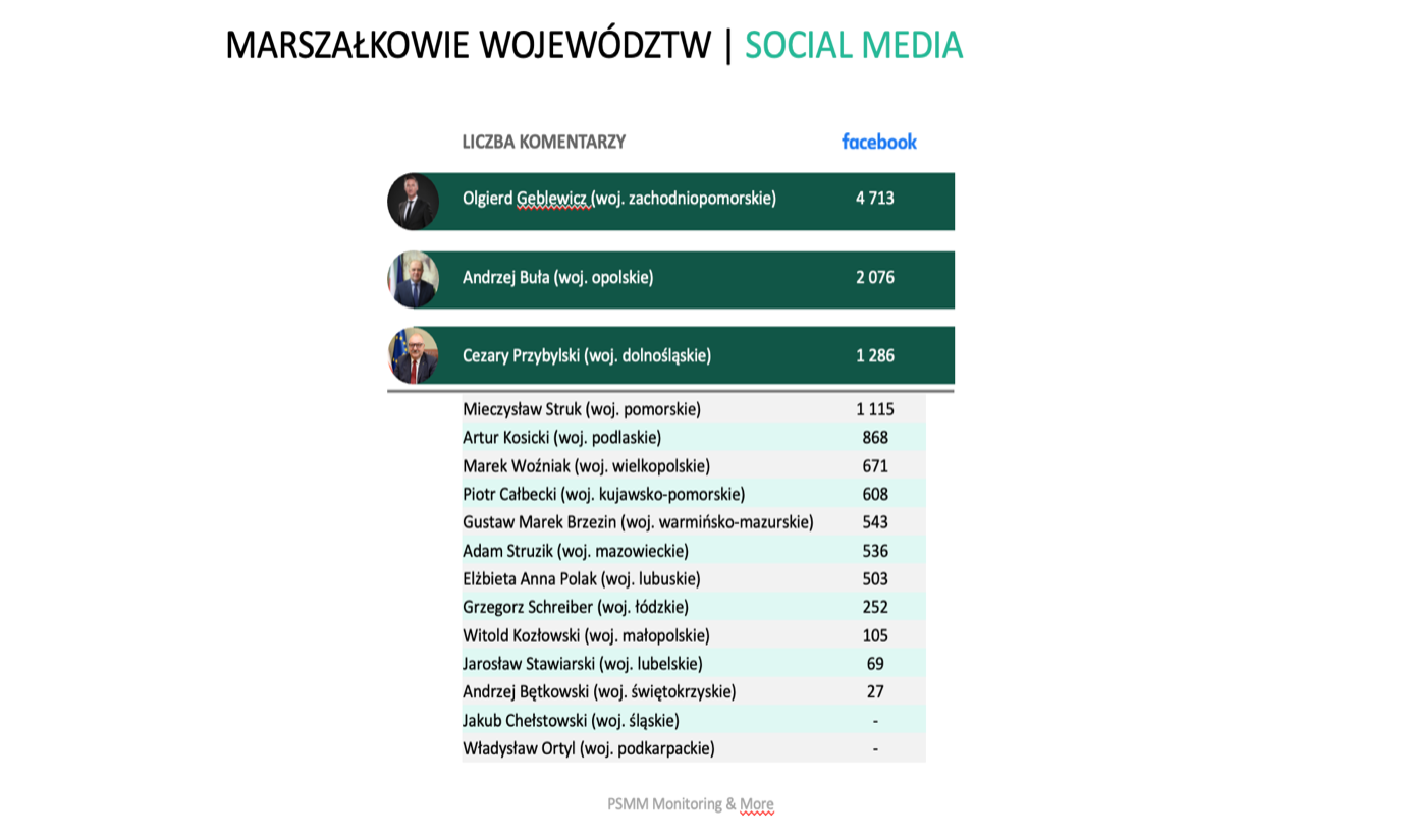 Jak wynika z raportu PSMM Monitoring & More pozycja marszałków województw w mediach tradycyjnych nie pokrywa się z miarą zaangażowania osiąganą przez nich w źródłach społecznościowych. Liczba publikacji w mediach tradycyjnych (prasa i internet) jest ściśle związana z tym, co polskie media uznały za ważny temat.
