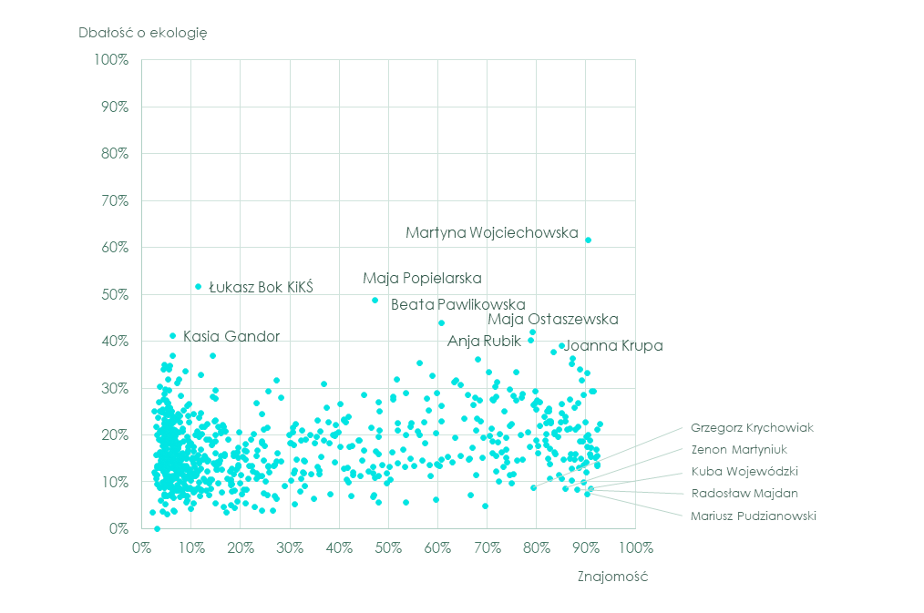 Wykres przedstawia poziom rozpoznawalności znanych postaci (oś pozioma) oraz ich wyniki dla stwierdzenia „Ważne są dla niej/niego kwestie ekologii i klimatu” (oś pionowa) w próbie reprezentatywnej dla populacji Polski w wieku 15-59 ze względu na płeć, wiek i wielkość miejscowości zamieszkania.