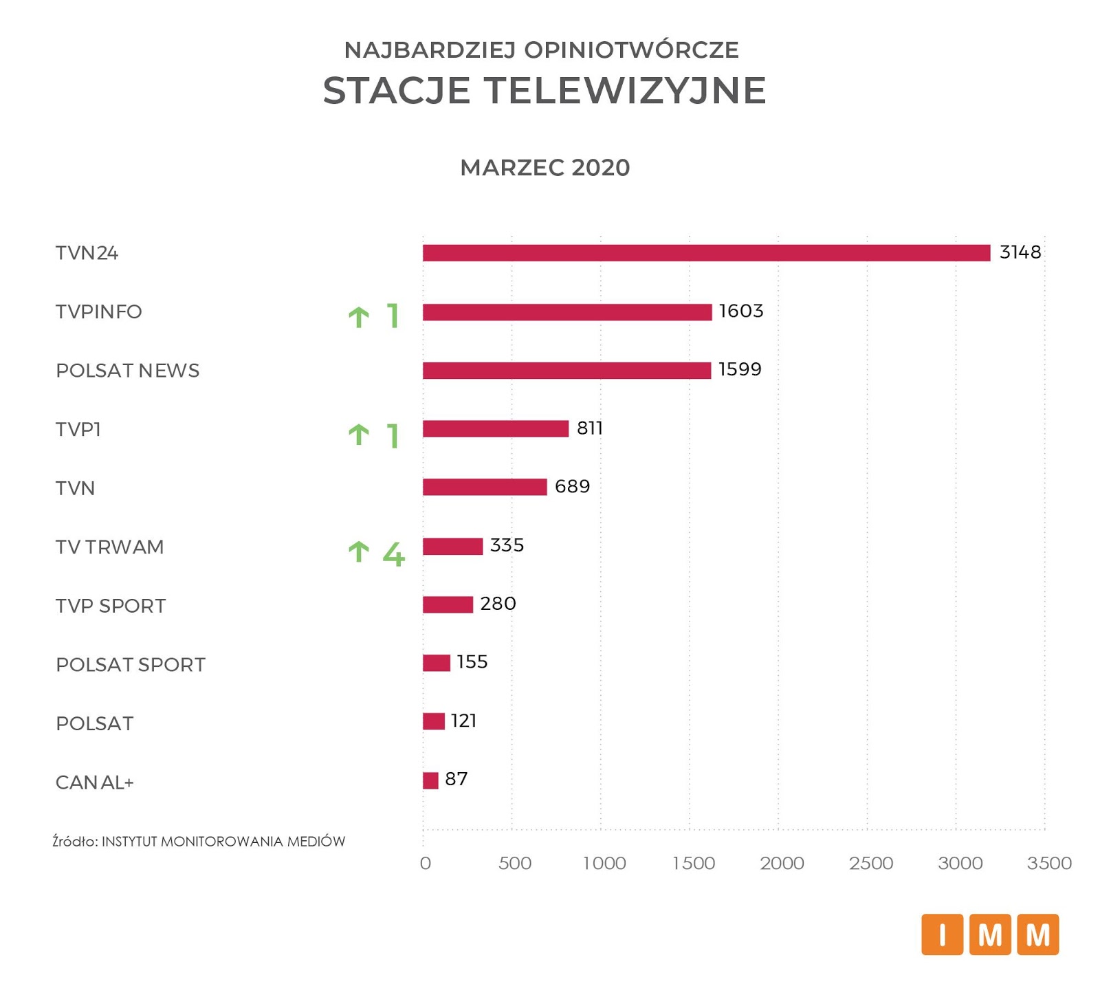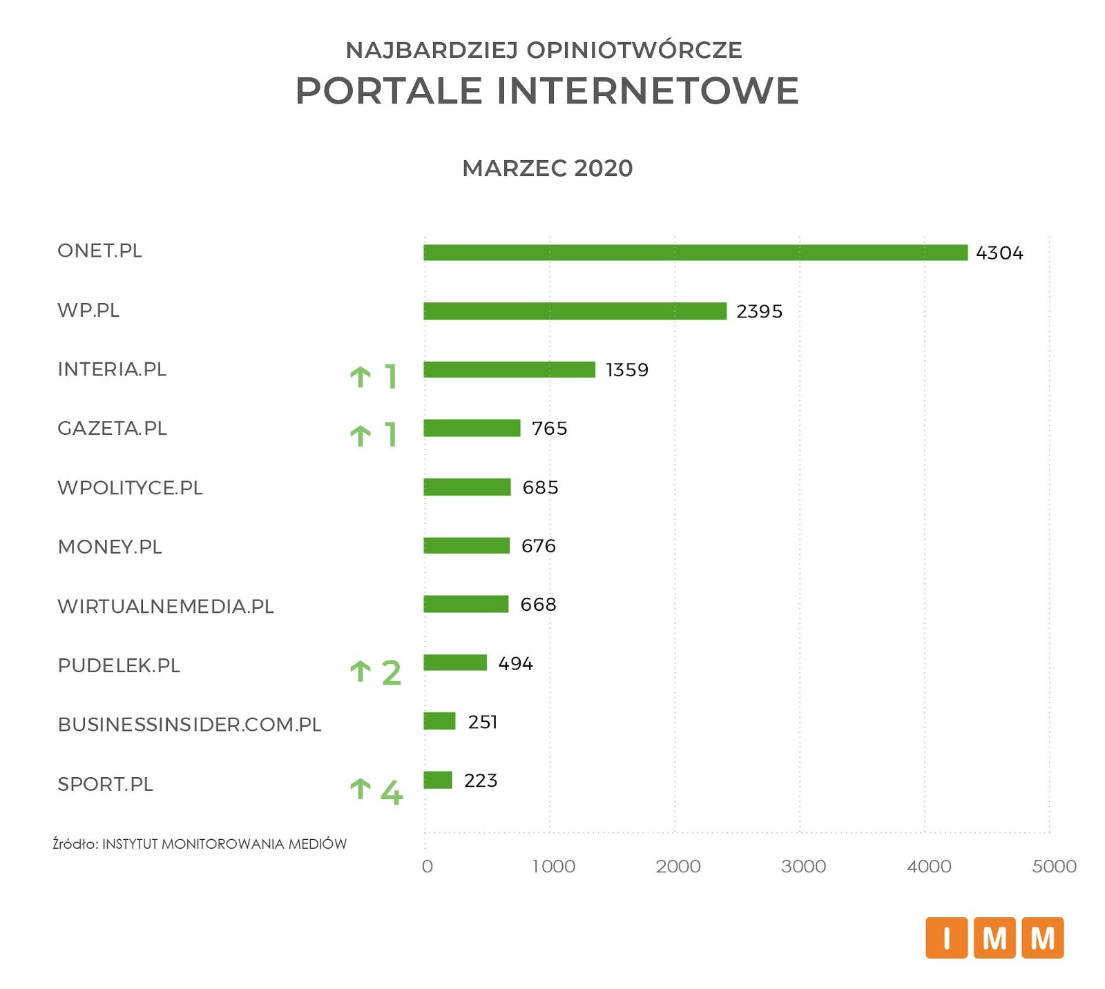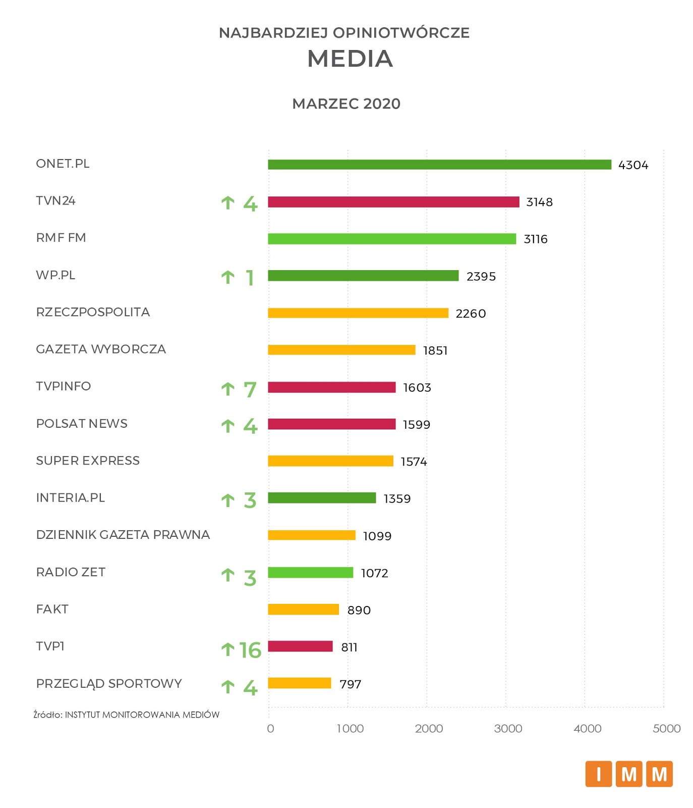 Najbardziej opiniotwórczym medium w Polsce w marcu 2020 r. według raportu Instytutu Monitorowania Mediów jest portal Onet.pl — niezmiennie od dwunastu miesięcy. Tuż za nim TVN24 i stacja RMF FM. Ranking zamyka zaś Przegląd Sportowy i TVP1 ze skokiem aż o szesnaście pozycji w górę.