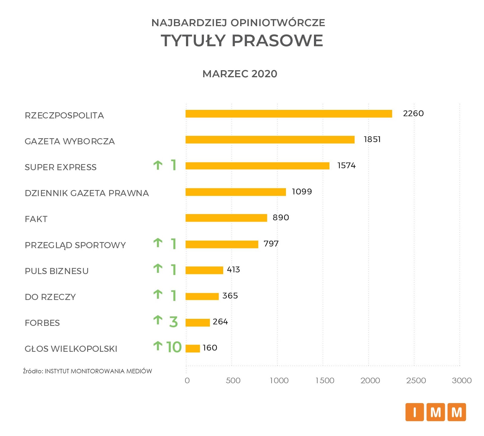Podium wśród tytułów prasowych otwiera Rzeczpospolita z 2260 wzmiankami. Za nią podobnie jak w lutym, Gazeta Wyborcza (1851 cytowań). Miejsce trzecie należy do Super Expressu, który w marcu cytowany był 1574 razy. Znaczący wzrost cytowań zanotował Forbes (trzy pozycję w górę w stosunku do lutego) i Głos Wielkopolski (ze skokiem w górę aż o dziesięć miejsc), które zamykają pierwszą dziesiątkę najbardziej opiniotwórczych tytułów prasowych.