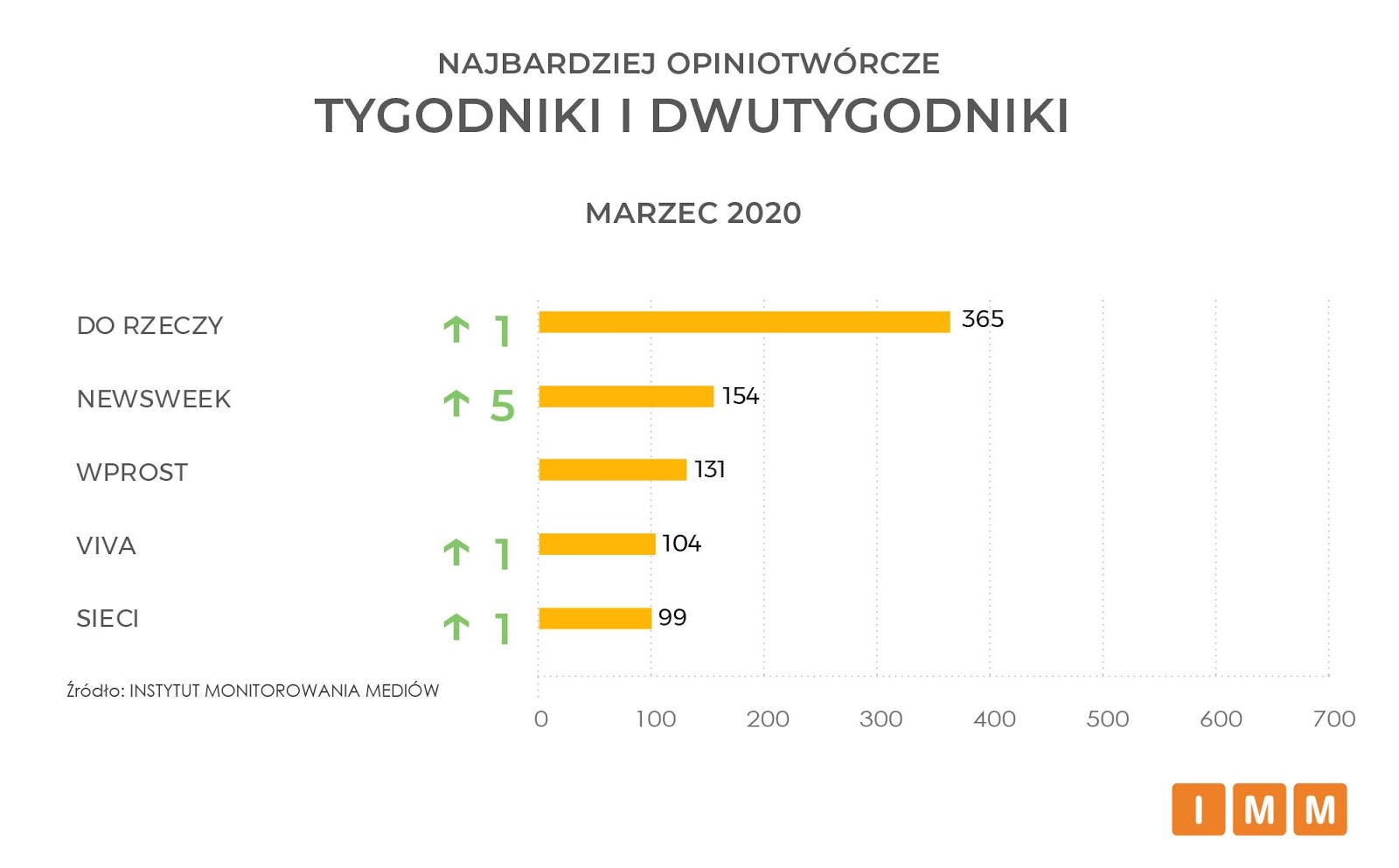 Najbardziej opiniotwórczymi tygodnikami i dwutygodnikami marca 2020 roku, są kolejno: Do Rzeczy i Newsweek, którego w lutym nie było w pierwszej piątce. Następnie, na podium tygodnik Wprost, który pomimo cytowań od 30 marca nie jest już dostępny na rynku w formie papierowej. Prawie dwukrotnie większą liczbę wzmianek zanotowano w gazecie Sieci, która zamyka ranking.
