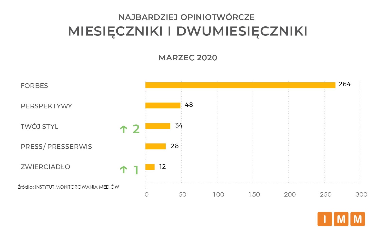 W kategorii najbardziej opiniotwórczych miesięczników i dwumiesięczników na pierwszym miejscu podobnie jak w lutym, uplasował się Forbes z łączną liczbą cytowań wynoszącą 264. Drugie miejsce zajmuje magazyn Perspektywy z liczbą cytowań 48. Następnie ze wzrostem Twój Styl, dwumiesięcznik Press oraz Zwierciadło.