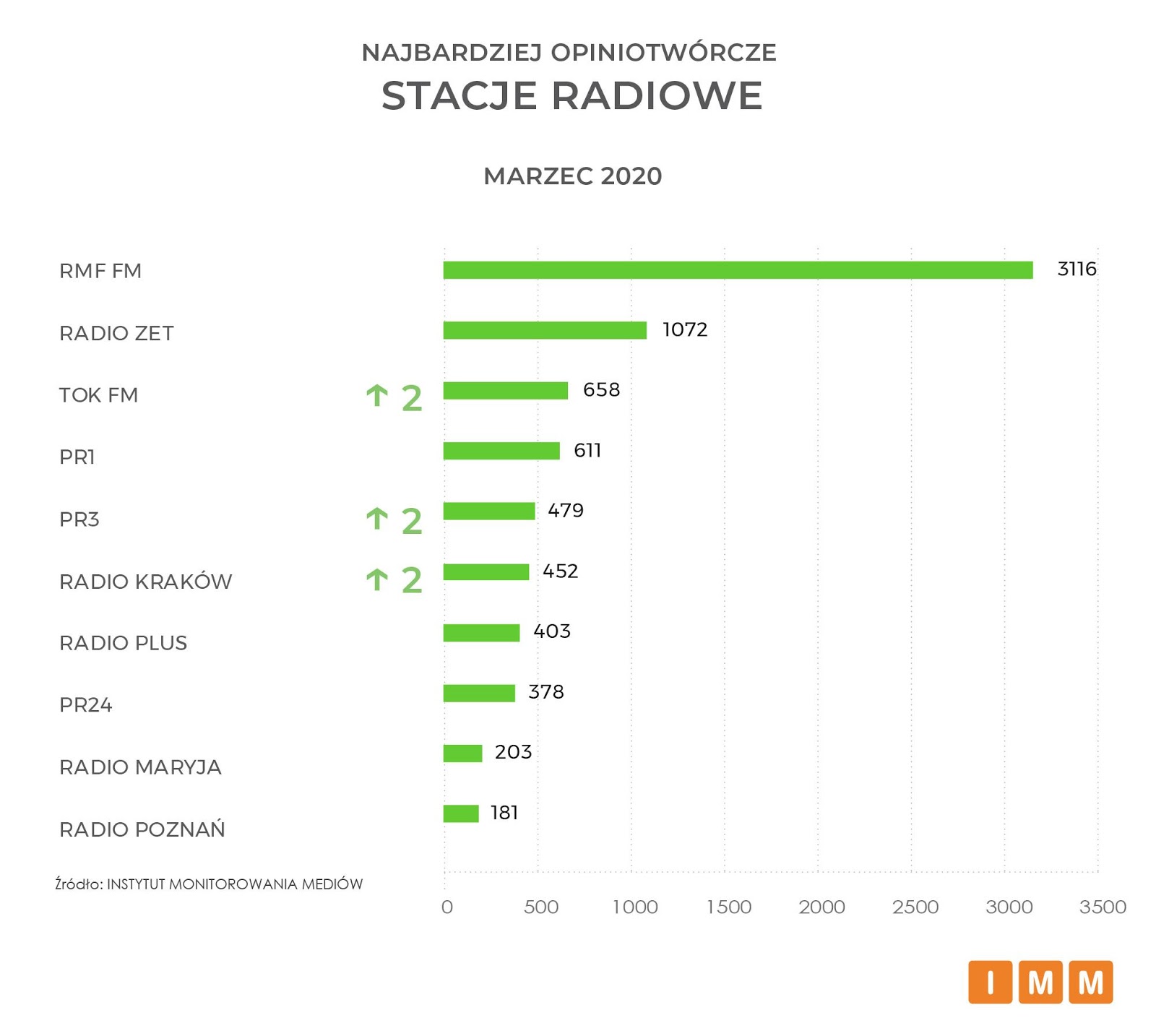 W kategorii „Stacje Radiowe” na pierwszym miejscu w marcu niezmiennie RMF FM z 3116 wzmiankami w innych mediach. Za nim Radio Zet oraz TOK FM ze skokiem w górę o dwa miejsca. Bardzo duże wzrosty występują w przypadku Radia Kraków oraz Programu Trzeciego. Co więcej, w tej kategorii wzrosty w ilości cytowań w stosunku do lutego obejmują wszystkie tytuły z rankingu.