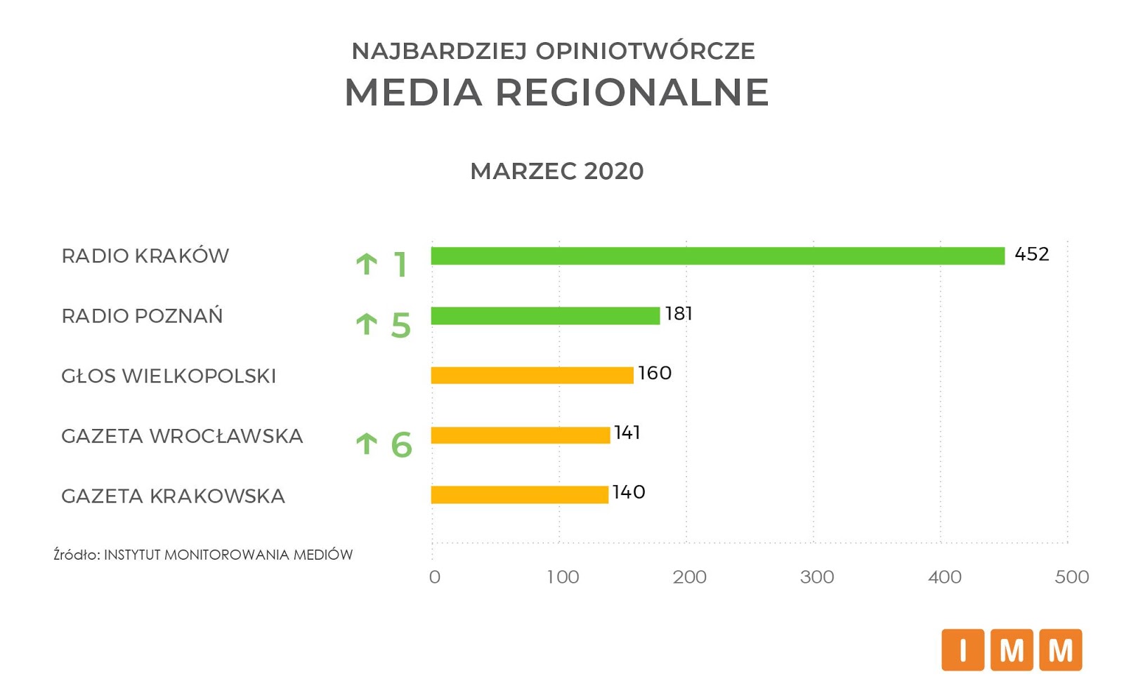 Wśród mediów regionalnych w marcu prym wiedzie Radio Kraków z 452 cytowaniami. Za nim w rankingu odnotowujące również bardzo duży wzrost Radio Poznań (aż pięć pozycji w górę w stosunku do lutego br.). Trzecie miejsce należy do Głosu Wielkopolskiego, a ranking zamykają Gazeta Wrocławska i Gazeta Krakowska. Każdy ze wspomnianych tytułów był cytowany częściej niż w lutym.