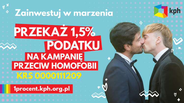 Każdy, kto rozlicza podatek, ma możliwość przekazania 1,5% na KPH. Wystarczy w odpowiednim miejscu formularza PIT wpisać numer KRS Kampanii Przeciw Homofobii: 0000111209.