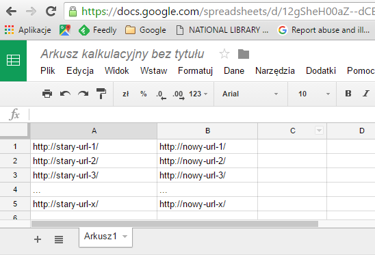 Adresy URL z listy wklejamy do nowo utworzonego arkusza kalkulacyjnego w Google Drive. Stare adresy do kolumny A, nowe odpowiednio do kolumny B.
