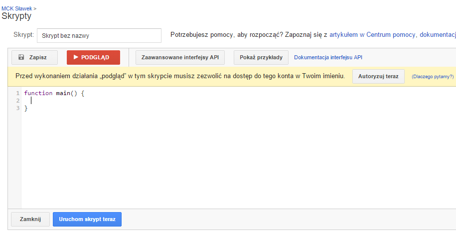 Przyszedł czas, aby utworzyć nasz nowy skrypt. W tym celu klikamy czerwony przycisk +SKRYPT. Po chwili pojawi się okienko prostego edytora tekstowego przypominające to z obrazka poniżej: