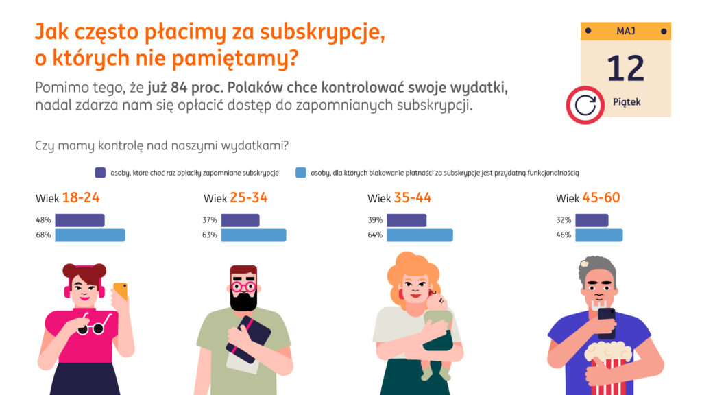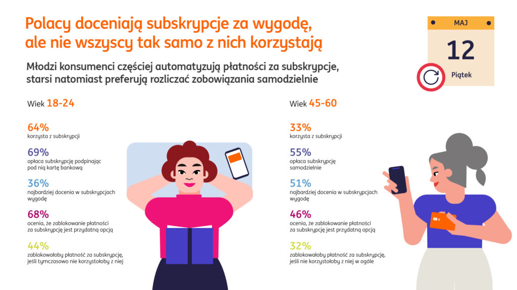 Najważniejszym argumentem za korzystaniem z subskrypcji jest wygoda – wskazało na nią 47 proc. badanych. Nie dziwi więc, że najbardziej popularna forma płatności za tego typu abonament to powiązanie go z kartą bankową, aby cykliczne rozliczenie było automatyczne. W taki sposób swoje zobowiązania za subskrypcje reguluje ponad połowa Polaków. Badanie pokazało, że taka forma płatności jest szczególnie popularna wśród najmłodszej grupy respondentów – wybiera ją aż 69 proc. osób w przedziale wiekowym 18-24 lat. Wraz z wiekiem maleje odsetek osób, które automatyzują swoje cykliczne płatności. Dla kontrastu, osoby ze starszych pokoleń preferują samodzielne opłacanie subskrypcji np. przelewem. Z takiego rozwiązania korzysta aż 55 proc. osób w wieku 45-60 lat.