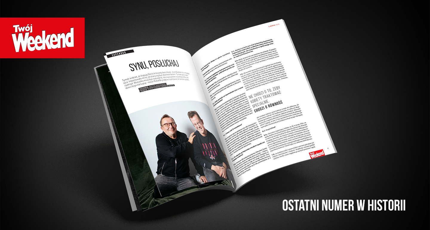 Ostatni „Twój Weekend” to historie kobiet i mężczyzn, przedstawione w artykułach, wywiadach i felietonach. Magazyn składa się z 48 stron autentycznych, poruszających treści, które powinien przeczytać każdy, bez względu na płeć. Wśród autorów znaleźli się m.in. Rikha Sharma Rani, dziennikarka współpracująca m.in. z „New York Times”, Maria Rotkiel, terapeutka i psycholożka, oraz Rafał i Tymek Bryndalowie, Miłosz Brzeziński czy Rafał Madajczak.